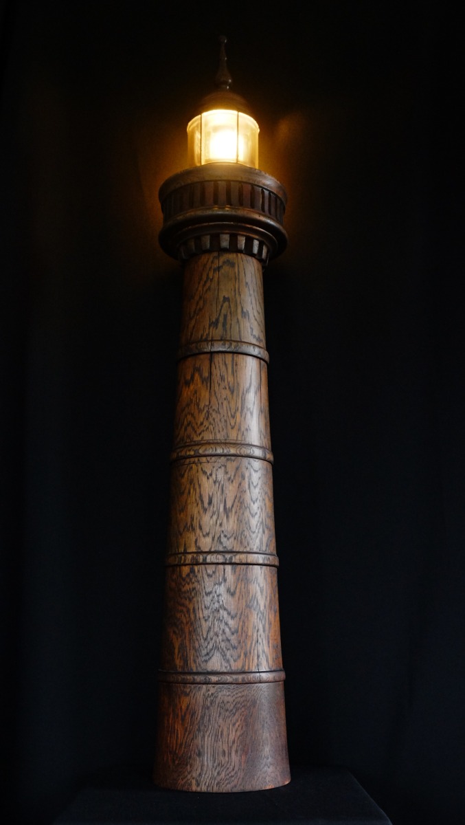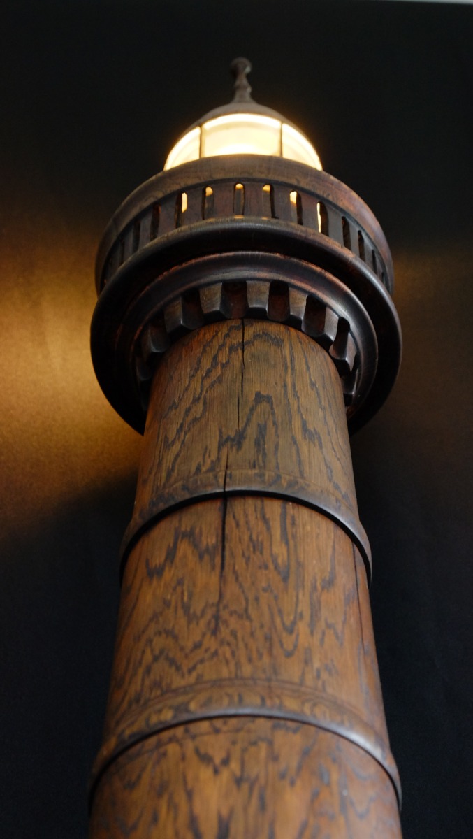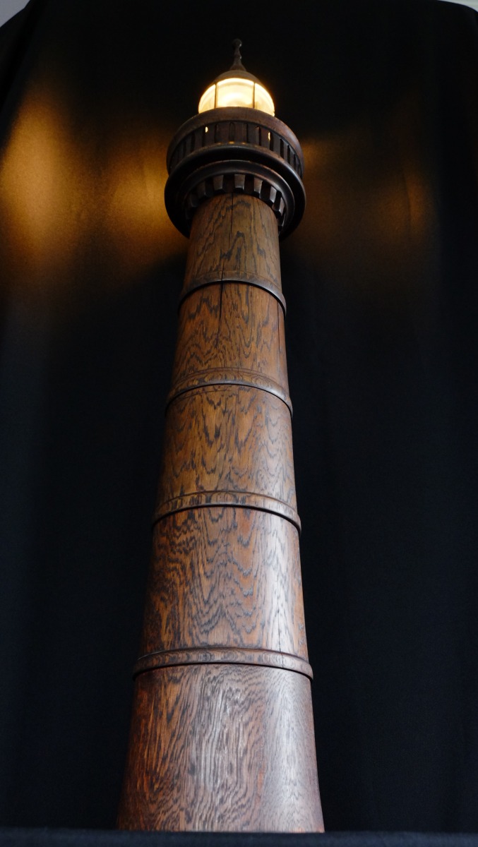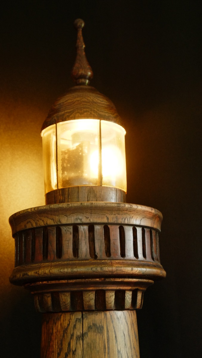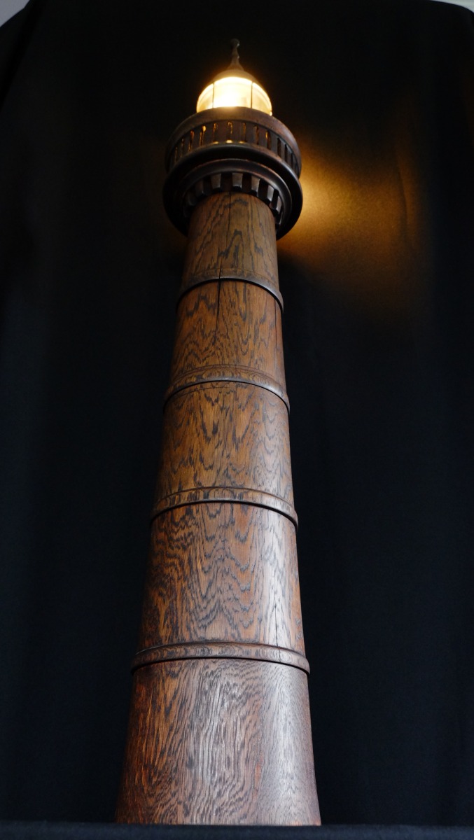Każdy detal tej monumentalnej formy został odwzorowany z wyjątkową dbałością o autentyzm – od smukłej, zwężającej się wieży, po wiernie odtworzoną kopułę z obrotowym modułem świetlnym przypominającym dawny reflektor Fresnela. Ciepłe, pulsujące światło przenika przez mleczne szkło, tworząc złotą poświatę, która miękko odbija się od naturalnej faktury dębowego drewna.
