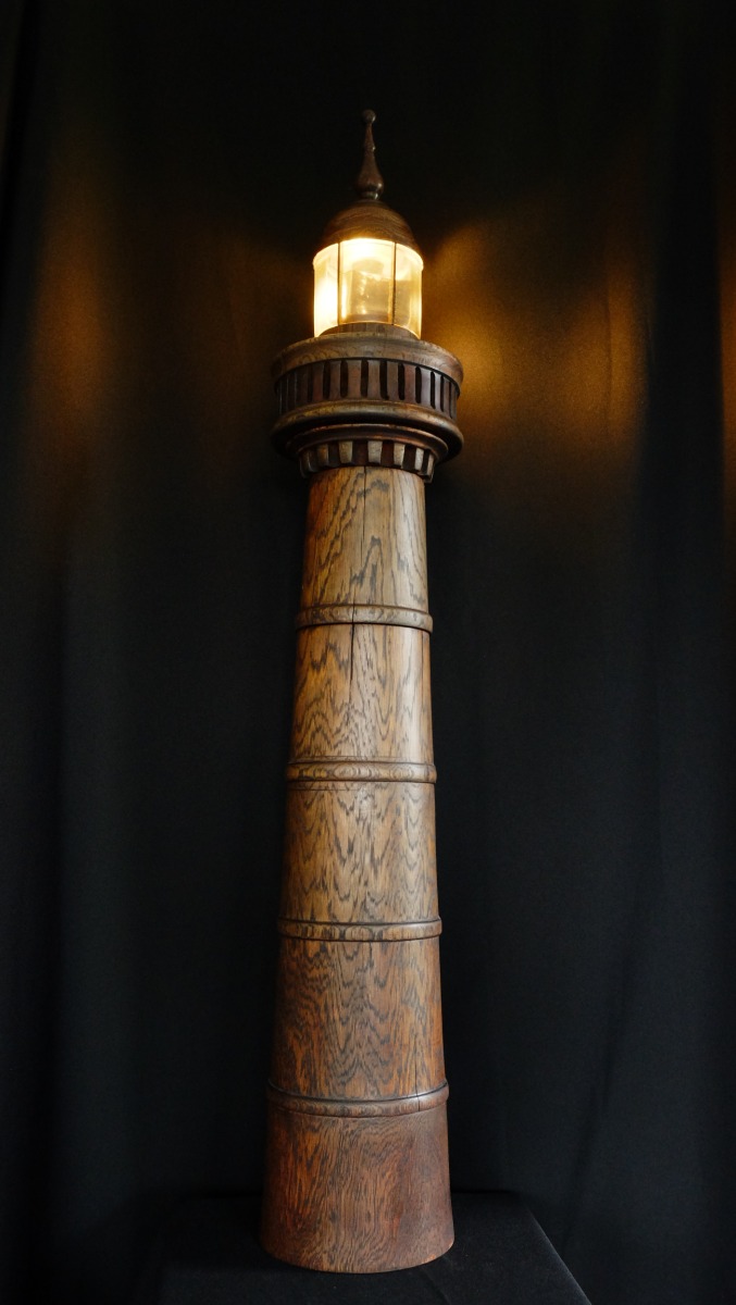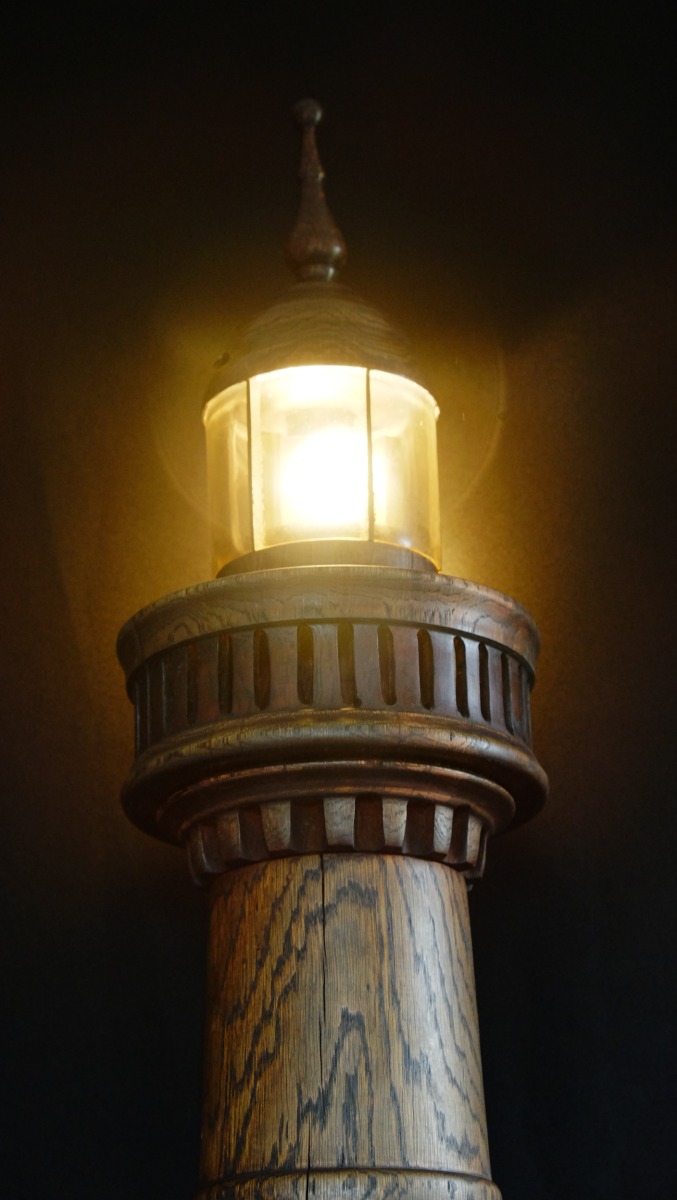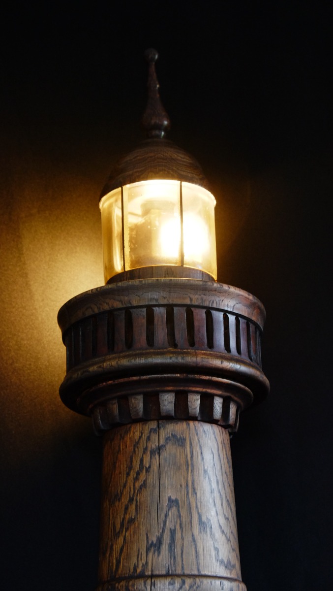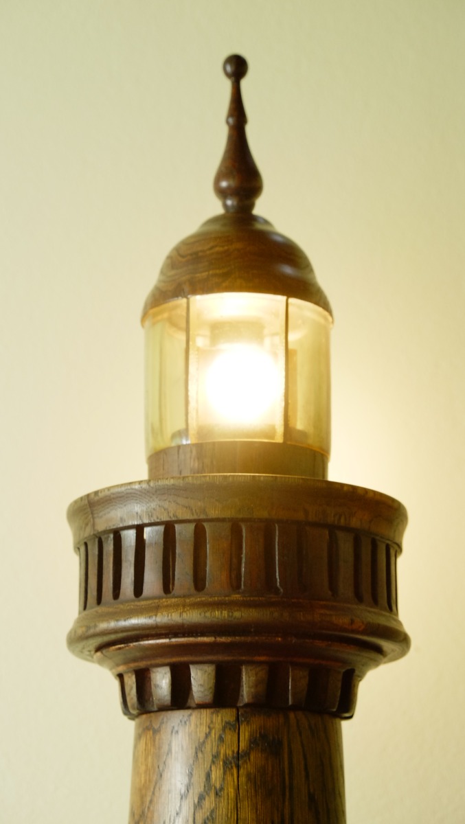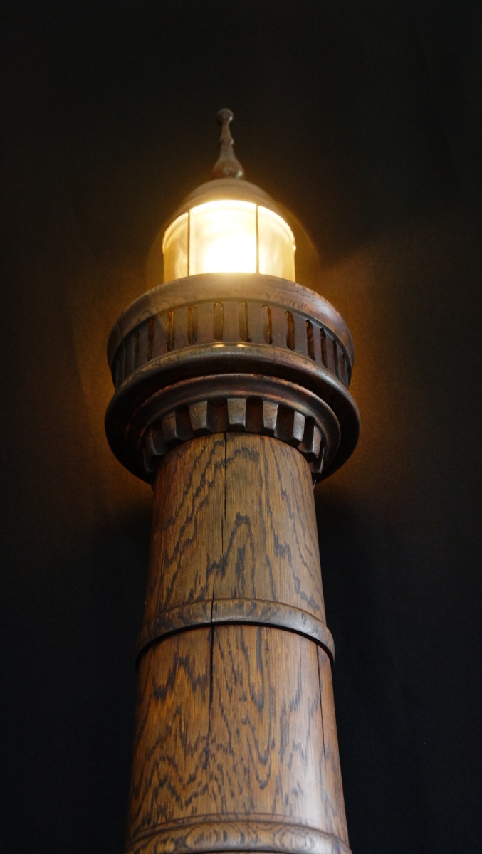 Każdy detal tej monumentalnej formy został odwzorowany z wyjątkową dbałością o autentyzm – od smukłej, zwężającej się wieży, po wiernie odtworzoną kopułę z obrotowym modułem świetlnym przypominającym dawny reflektor Fresnela. Ciepłe, pulsujące światło przenika przez mleczne szkło, tworząc złotą poświatę, która miękko odbija się od naturalnej faktury dębowego drewna.