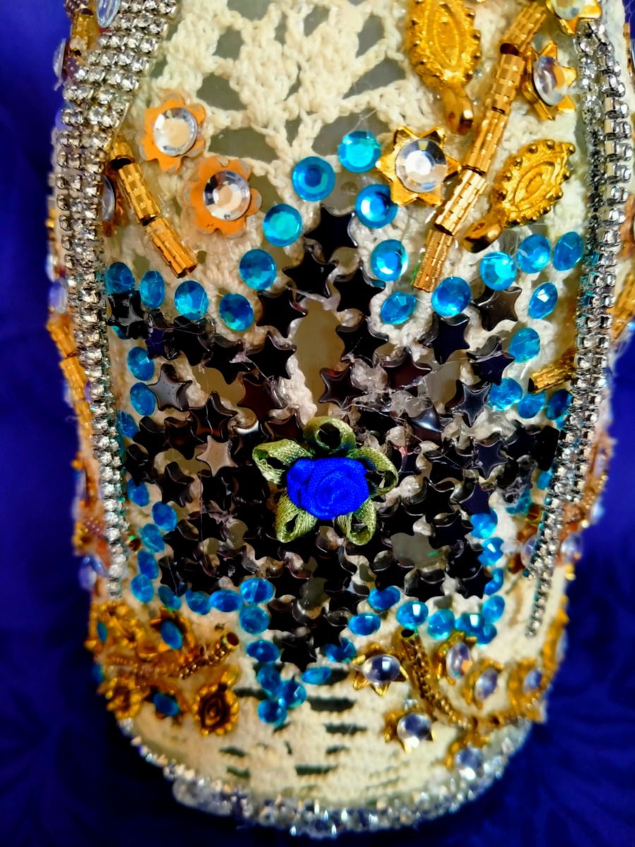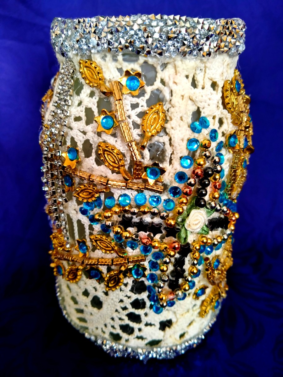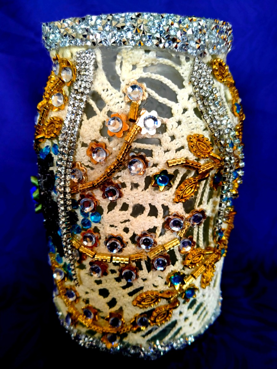 Do sprzedania posiadam własnoręcznie wykonany lampion szklany z własnoręcznie wykonaną dekoracją w formie gwiazdy/kwiatu. Dekoracja z koralików, biżuteryjnych dodatków, błyszczących listków i dżecików jako oczka kwiatków.
