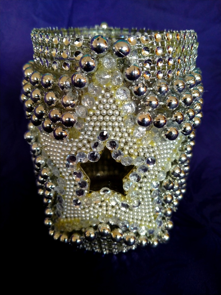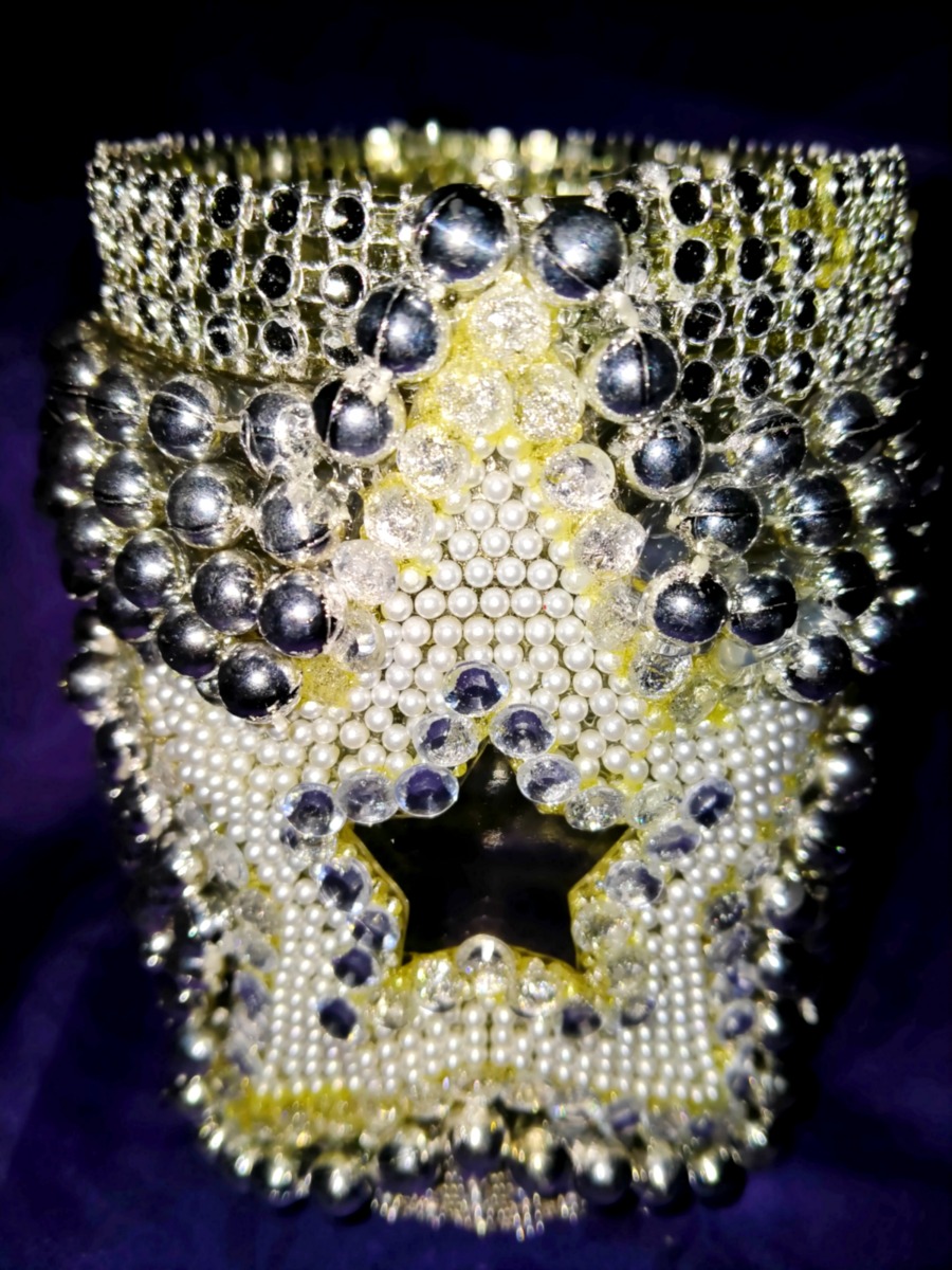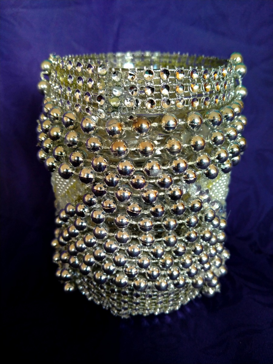 Własnoręcznie wykonany szklany lampion z dekoracją w gwiazdę i błyszczący dekoracyjny łańcuszek, jak biżuteryjny. Świetnie się prezentuje jako dekoracja sama w sobie, jak i